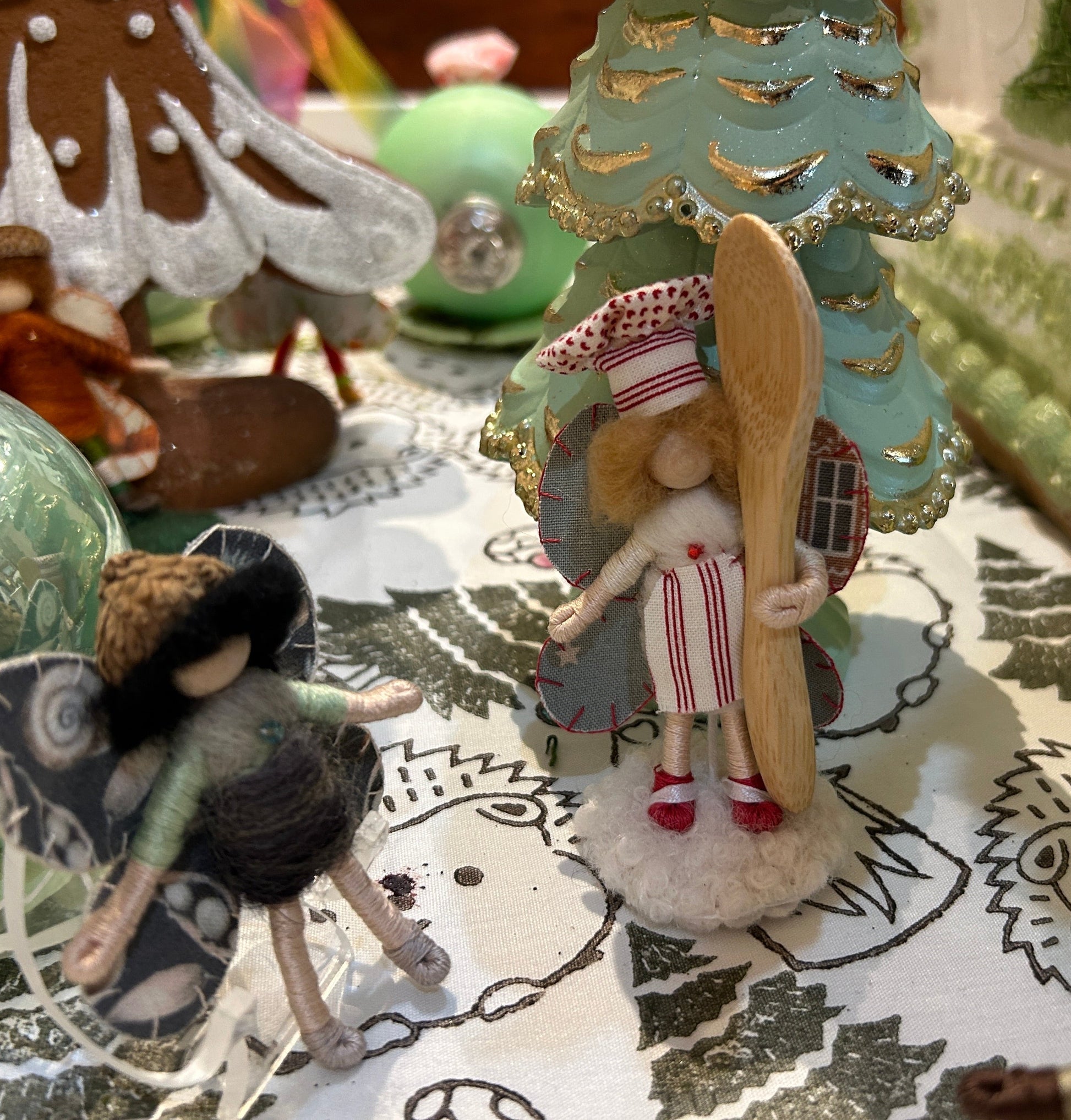 A friend ready for holiday baking! Wings, apron and hat are created from holiday fabrics by Tilda. Bamboo spoon. Stand.