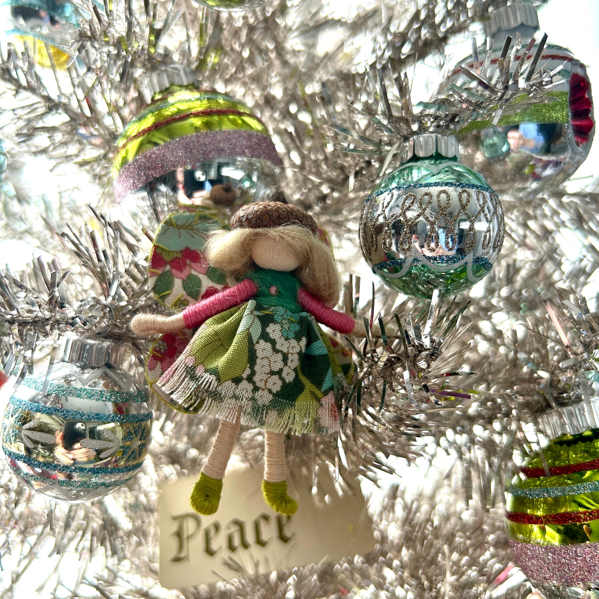 Needlefelted of a soft blend of Merino, Yak and silk roving hand dyed in shades of green. Wings and skirt of coordinating “Wildflower” fabrics in soft greens, mint, teal, pinks and creams from Tilda. Blonde silk hair. Seed bead and acorn cap.